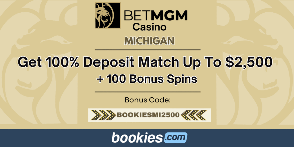 100% Deposit Match up to $2,500 Plus, 100 Bonus Spins when registering for a new account with the BetMGM Michigan Casino Bonus Code BOOKIESMI2500 .