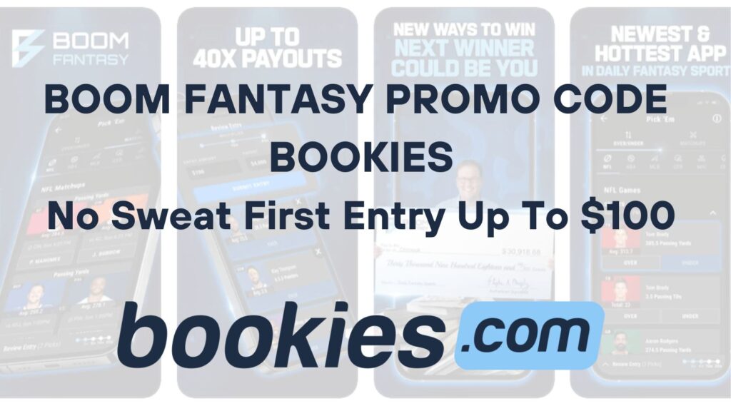 The Boom Fantasy Promo Code BOOKIES gives new users a No Sweat First Entry for up to $100. To claim this welcome offer, download the Boom Fantasy app and sign up for a new account using Boom Fantasy Promo Code BOOKIES and make your first deposit to get a No Sweat First Entry for up to $100.