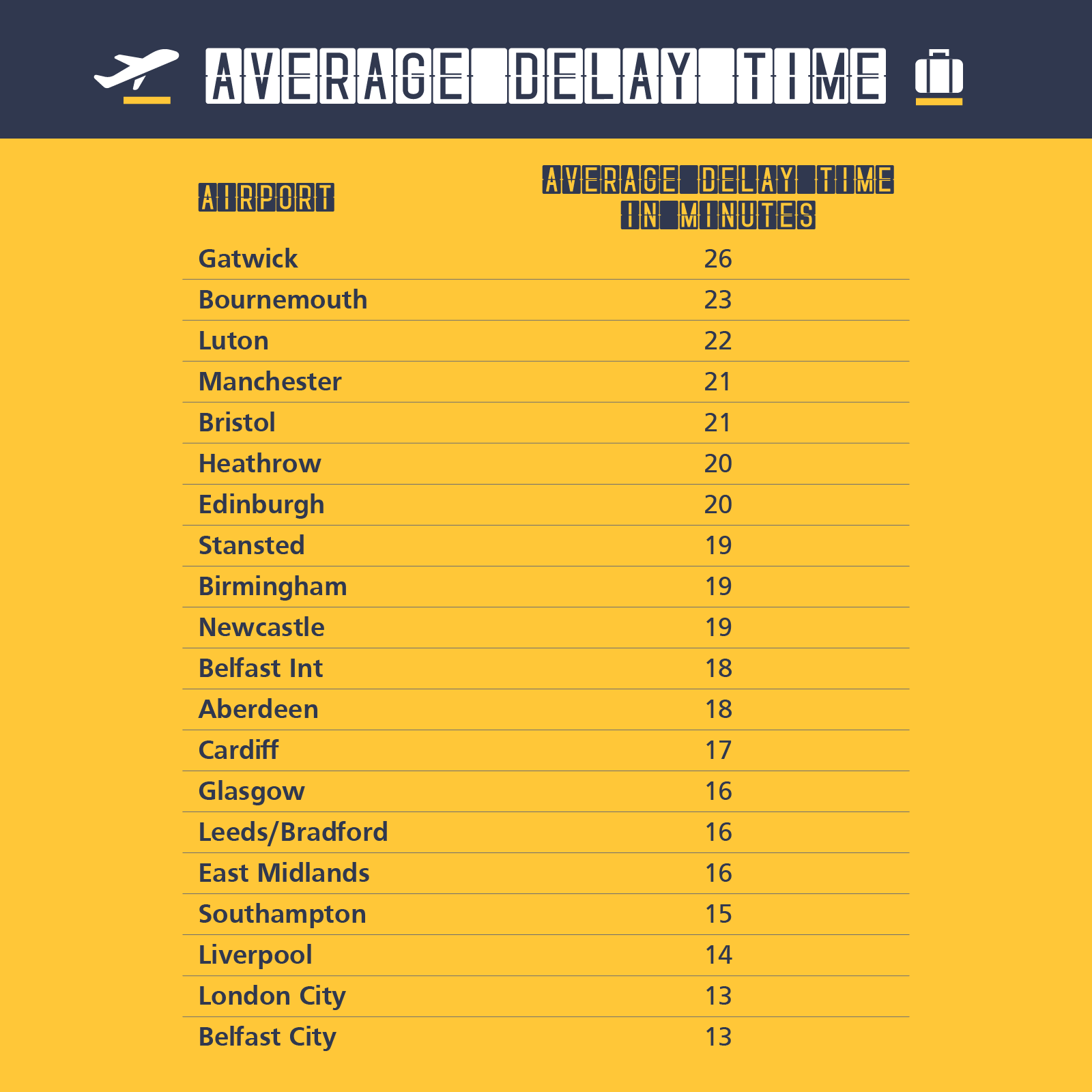 While we praised Bournemouth earlier in this article for its efficiency in having the fewest flights cancelled, it appears that comes at a cost. Bournemouth is second on the list of delays with passengers experiencing an average delay of 23 minutes.