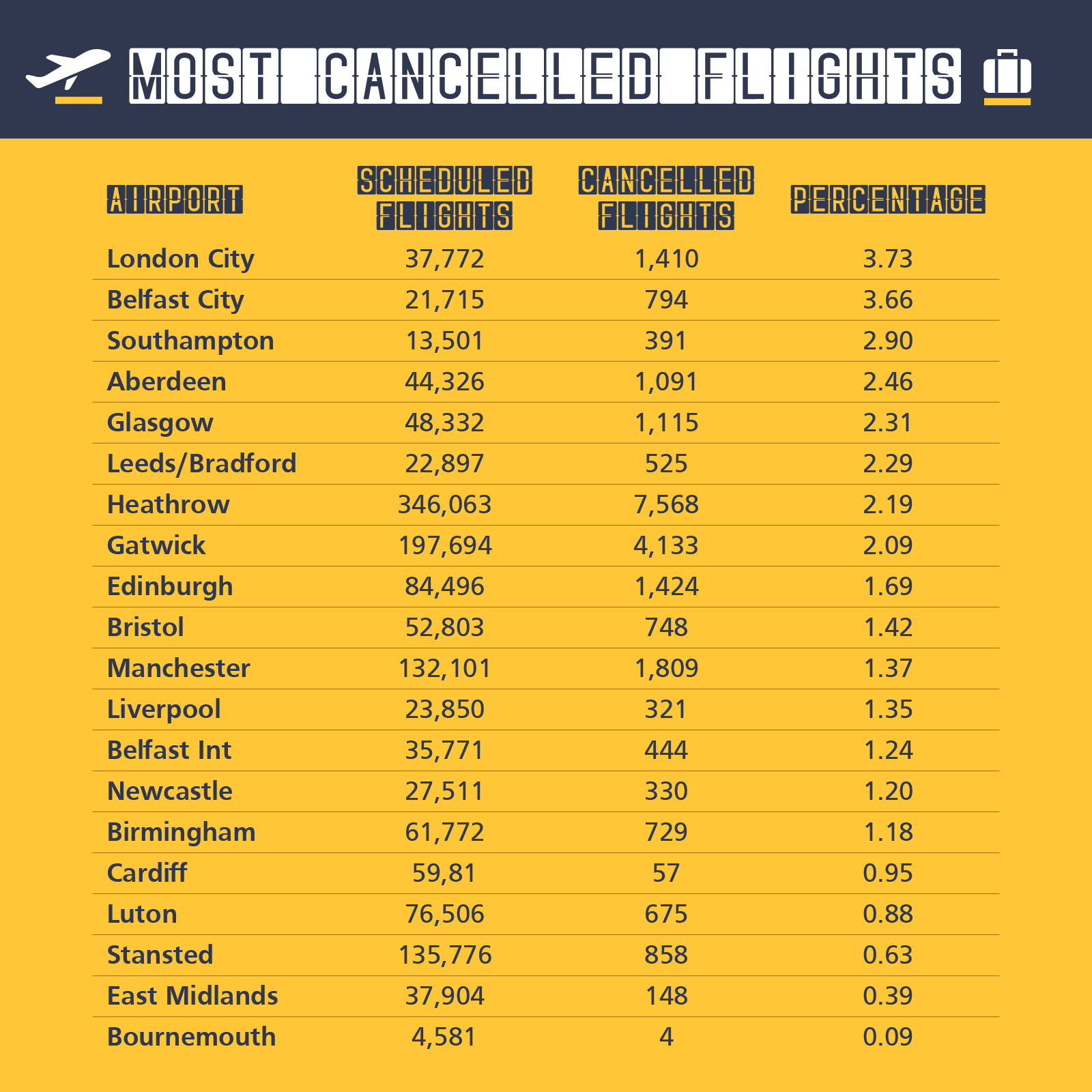 Stansted Airport is the third busiest airport in terms of flights scheduled in our study, and it was one of the most efficient in the UK. From 1 January to 30 September, a total of 135,776 flights were scheduled to take off from Stansted and to their credit, only 858 (0.63%) had to be cancelled.